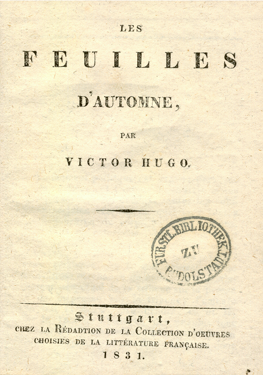 Par ailleurs, M. Ducimetière, a eu le bonheur d’acheter une édition très rare des Feuilles d’automne, un in 16 carré de 222 pages, dont la page de titre porte comme nom d’éditeur « "Chez la Redadtion [sic] d'oeuvres choisies de la littérature française", comme lieu d’édition Stuttgart et comme date 1831.