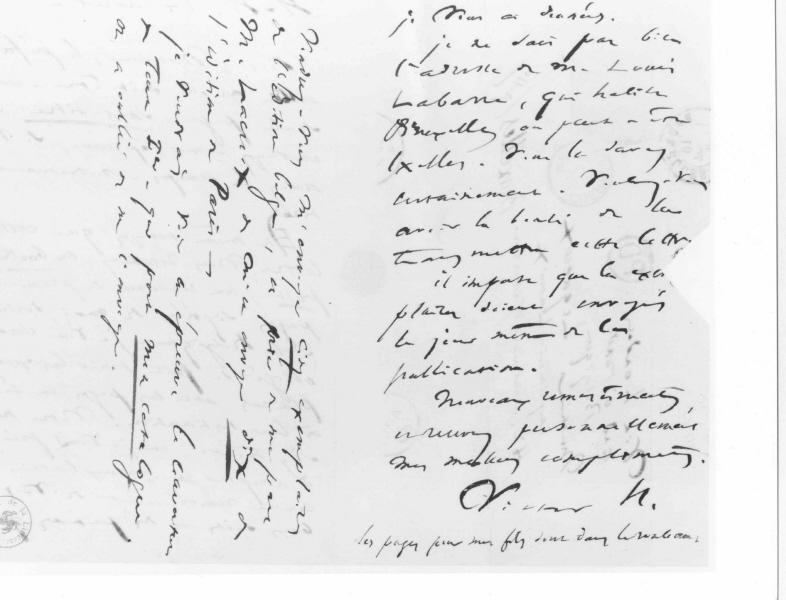 Elle ne demande pas d’explications particulières. On en est aux ultimes procédures de la publication de L’Homme qui rit dont le premier tome paraît le 19. L’état des relations entre Lacroix et Hugo, si mauvais que leurs communications sont toutes indirectes, explique que Hugo ne s’adresse pas à lui mais à son prote, M. Lequeux. Sans doute ne lui fait-il pas une confiance illimitée puisque, le même jour, il charge également Auguste Vacquerie de demander pour lui la couverture du premier tome portant son catalogue (Oeuvres complètes, éd. J. Massin, CFL, t. 14, p. 1271). Enfin, l’envoi des premières pages signées de L’Homme qui rit est confirmé par une note de l’agenda du 10 avril consignant l’affranchissement d’un envoi analogue pour Paris et par une lettre à Vacquerie du 12 le chargeant de porter un exemplaire avec une page spéciale à Léonie d’Aunet.