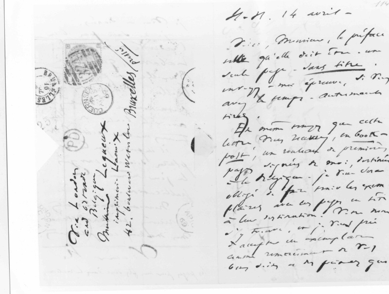 Lettre autographe signée « Victor H. », adressée à « Monsieur Lequeux », datée « H-H. 14 avril–» [1869]. Adresse autographe au verso : « Via London // and Ostende // Belgique // Monsieur Lequeux // imprimerie Lacroix // 42, boulevard Waterloo // Bruxelles // [en diagonale, encadré de deux traits : ] pressée ». Trois pages d’un double folio (22x17,5 cm). Plusieurs cachets postaux, de Bruxelles et Guernesey, portant les dates des 15 et 16 avril 1869.