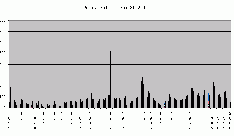 Cet histogramme des publications hugoliennes toutes catégories confondues montre un Hugo en proie à l’histoire et aux commémorations. C’est tout un, puisque la commémoration inscrit le temps dans le temps, fait événement de la mémoire, suture l’histoire-discours à l’histoire réelle. Les faits et les personnages historiques en ont donc le monopole, comme des anniversaires et des fêtes. La littérature n’y a pas droit parce que les œuvres se lisent au présent même si l’auteur a disparu –et sont pour cette raison réputées éternelles. En s’emparant de Hugo, la commémoration n’affirme donc pas l’excellence de ses livres mais son appartenance à l’histoire et le consacre, malgré la contradiction, écrivain historique.